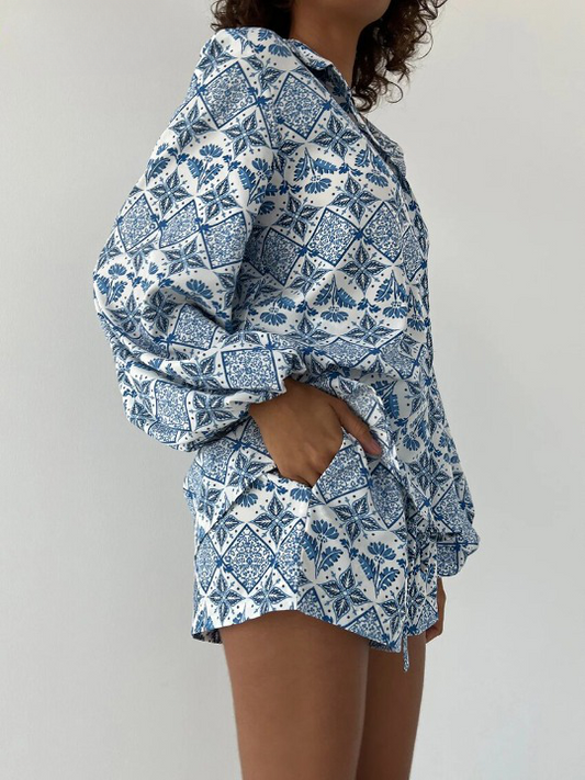 Ensemble 2PCS Chemise & Short Bleu Blanc imprimé