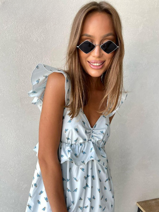 Robe longue bleu ciel imprimé floral à volants
