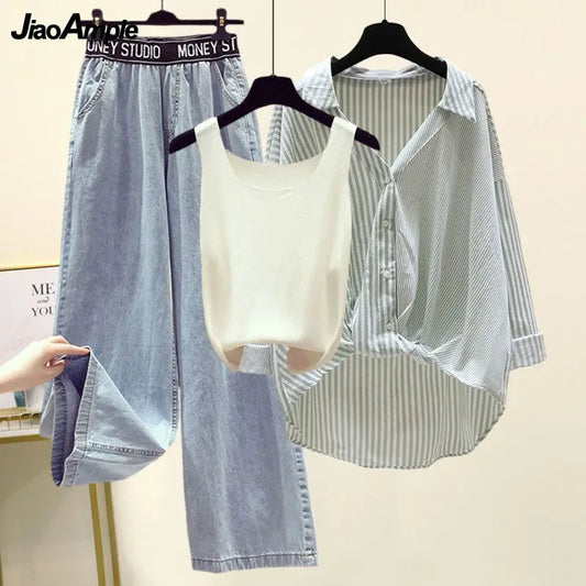 Ensemble 3PCS - Débardeur, Chemise à Rayures & Pantalon Ample