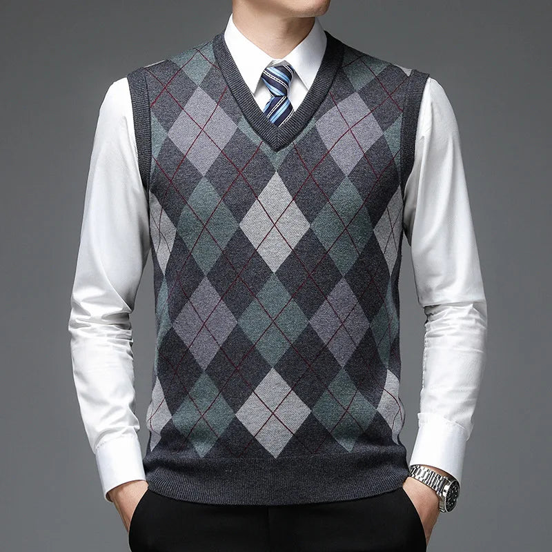 Ce **pull sans manche** au **col V** élégant et aux **motifs carreaux** est la pièce idéale pour les hommes recherchant un style décontracté mais raffiné. Avec sa coupe sans manche, il offre une fluidité unique tout en garantissant une chaleur optimale durant les saisons d'**automne et hiver**. Associez-le facilement à n’importe quel chemisier pour un look subtilement distinctif. 🎩