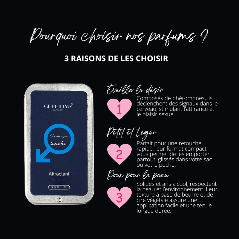 Les parfums phéromones deviendront votre arme secrète ! Enveloppez-vous d’une aura de sensualité qui ne laissera personne indifférent.